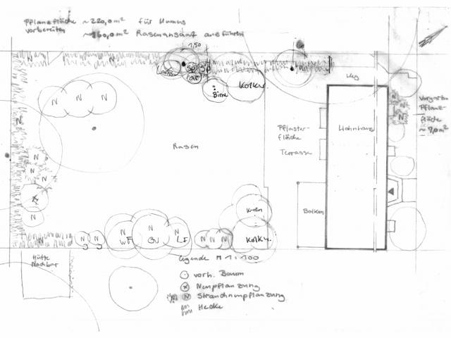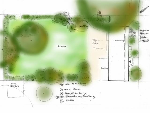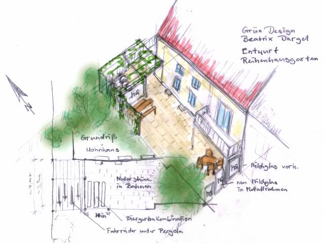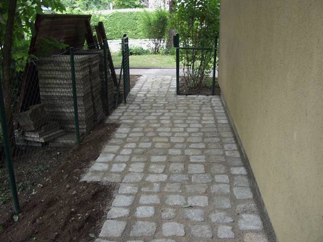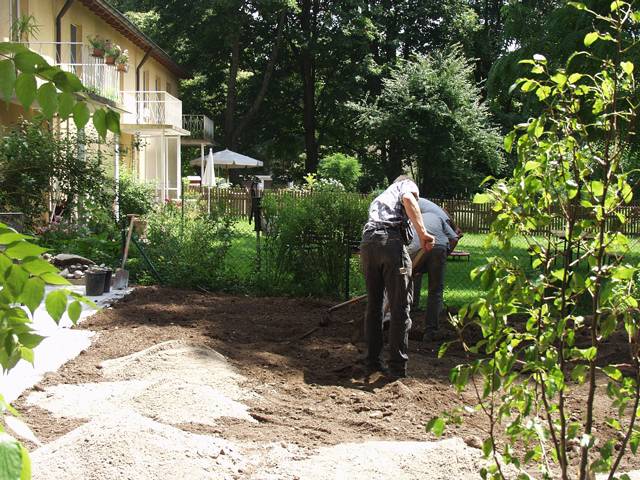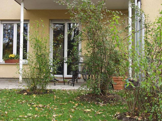 Auf der halben Gartenfläche standen überalterte Sträucher. Diese wurden entfernt und somit der Garten wieder nutz- und erlebbar. Eine Bretterwand diente als Sichtschutz. Ersetzt wurde diese durch eine gemischte Heckenpflanzung. Über einen Pflasterweg an der Giebelseite des Hauses gelangt man zur neu angelegten Terrasse mit Natursteinen. Der Strauch, der den Zugang versperrte, erhielt einen fachgerechten Verjüngungsschnitt. Der Rasen wurde ebenfalls neu angelegt.