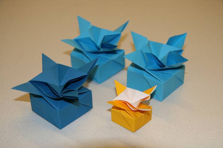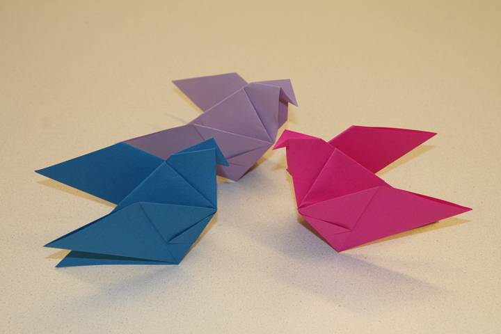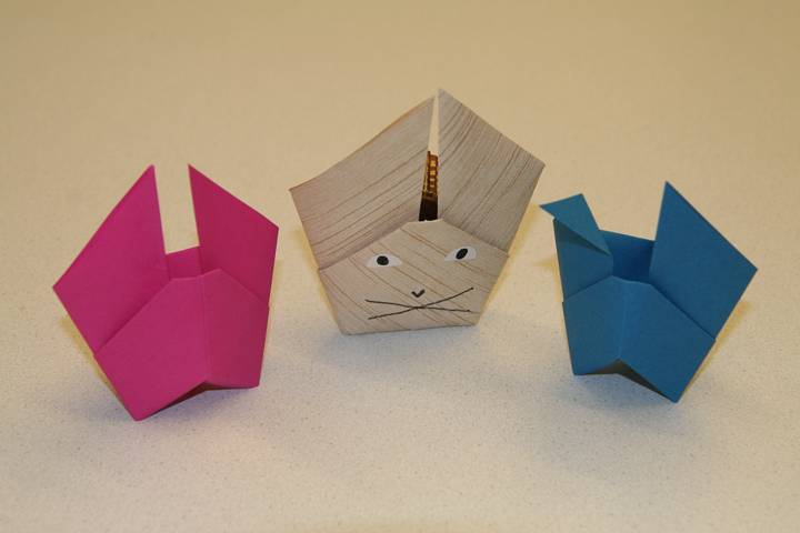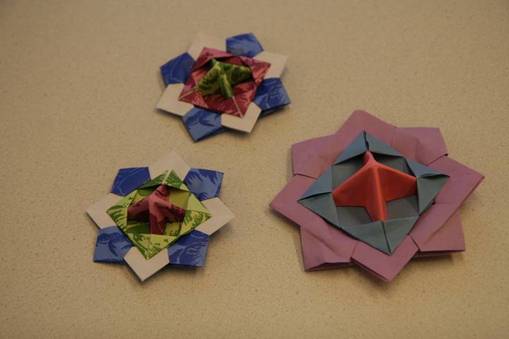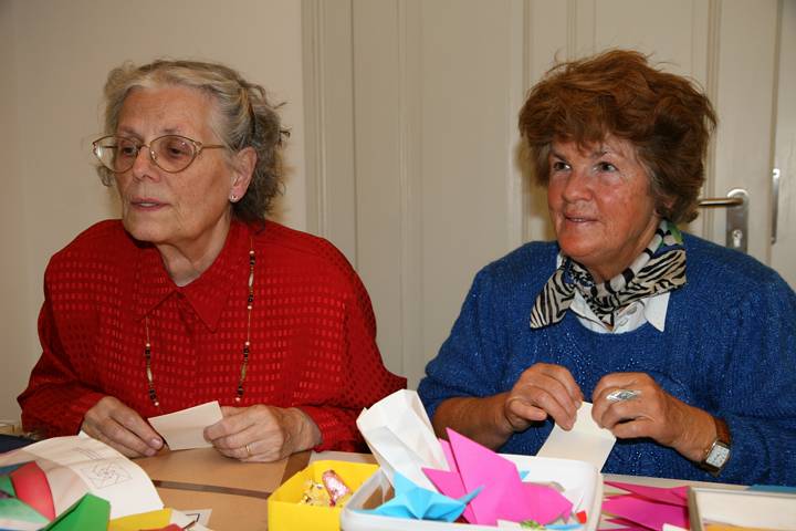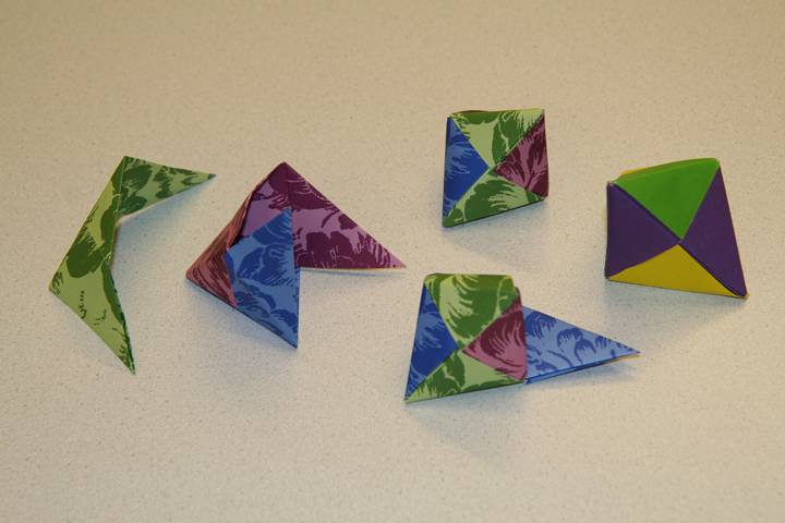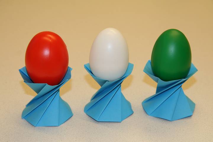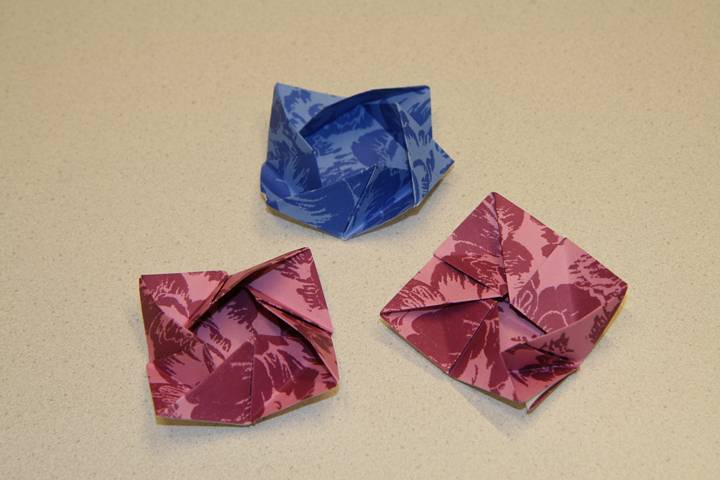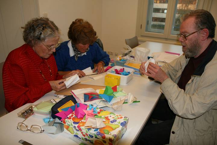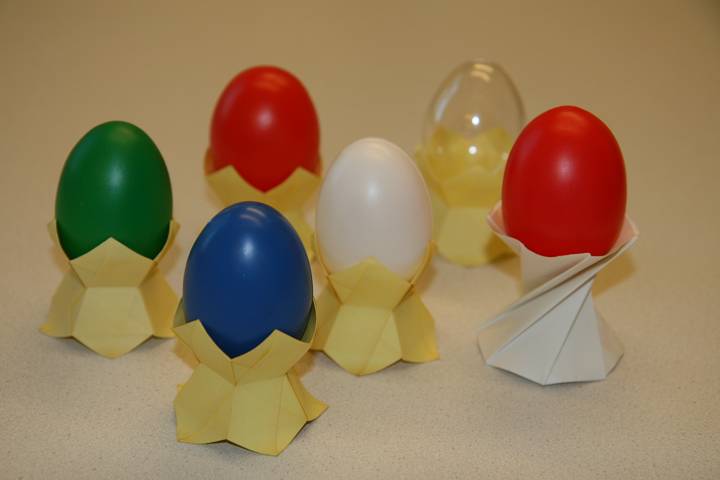 Bilder vom Treffen am 9. April 2007. Frühling in München selbst entfaltet :-), Eierbecher aus Papierstreifen und gedrehter Ständer von Helmut gefaltet, bunte Vögel, Kreisel besteht aus drei Papierquadraten, kunstvolle, filigrane Behältnisse aus einem quadratischen Blatt Papier, Osterhasenkopf mit kleinen Geschenken zu befüllen, Figur aus drei Modulen ineinander gesteckt, Rosenschale nach Modell von Nick Robinson