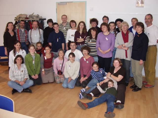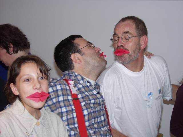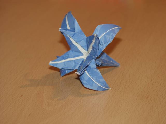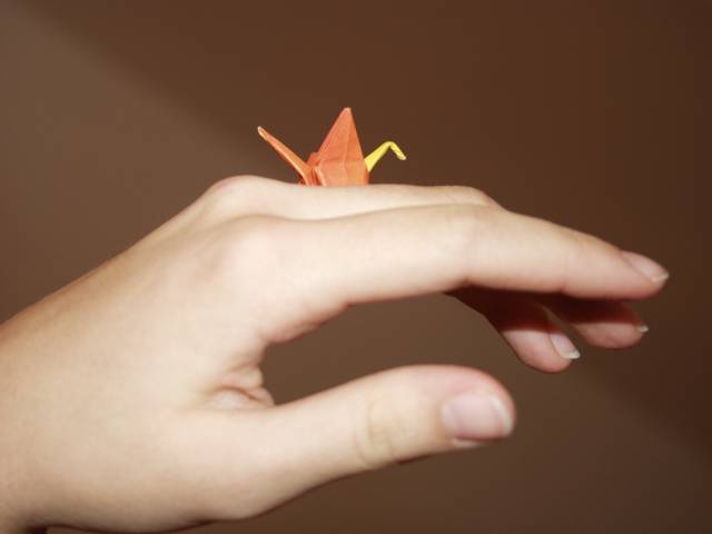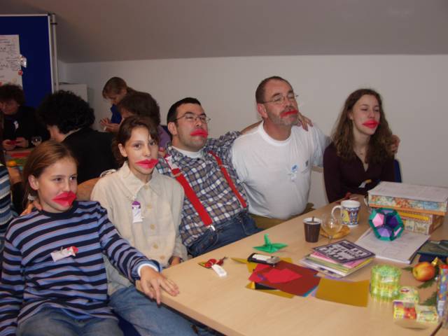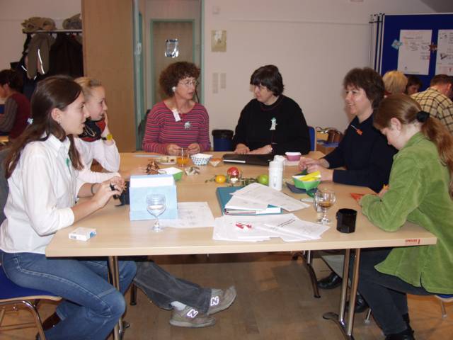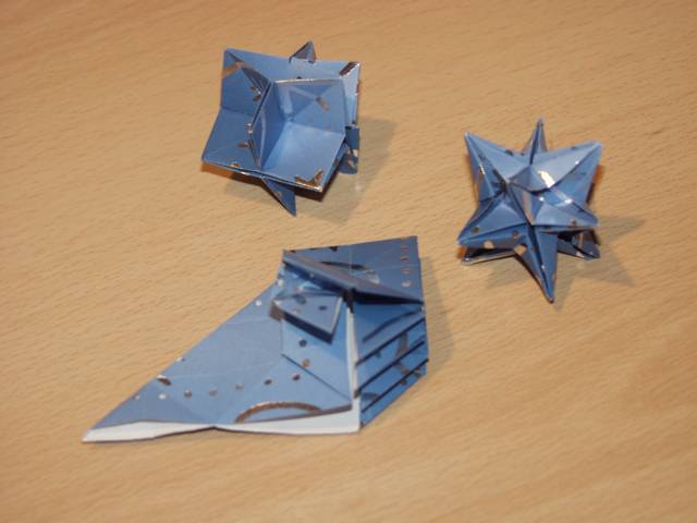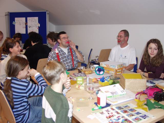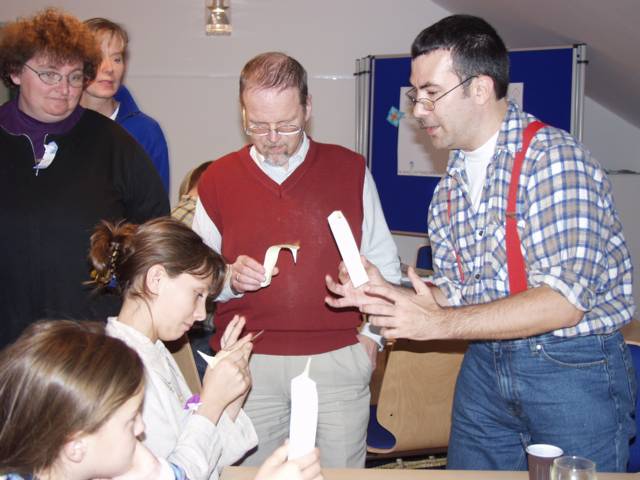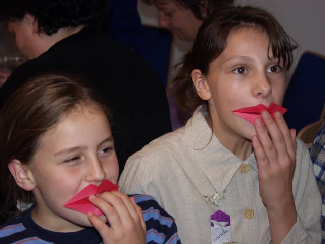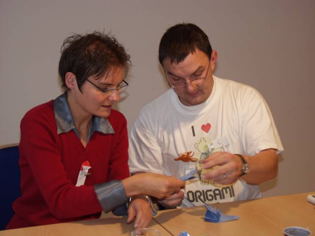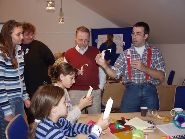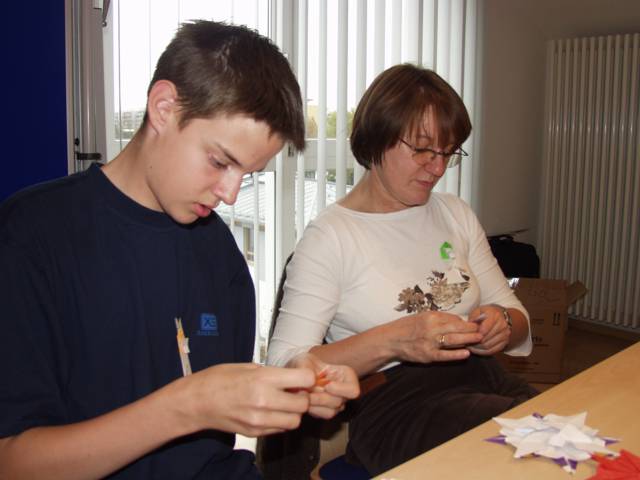 Origami in Taufkirchen 2003 Treffen Anfang November, ein ganzer Tag Zeit zum Falten, Spass kommt nicht zu kurz, Sterne, knallrotes "Lippengeflüster", Blütenkreation, an den Händen winzige Kranichringe - sehr kleidsam, Joan Sallas zeigt wie aus einem Streifen Papier eine einfache Figur entsteht...