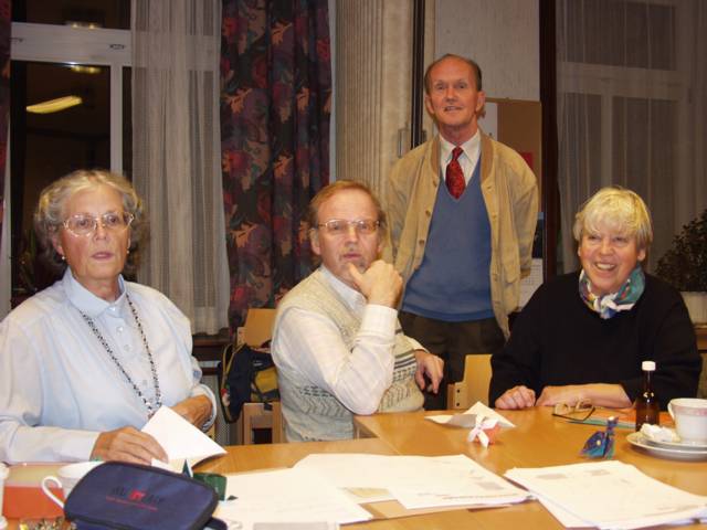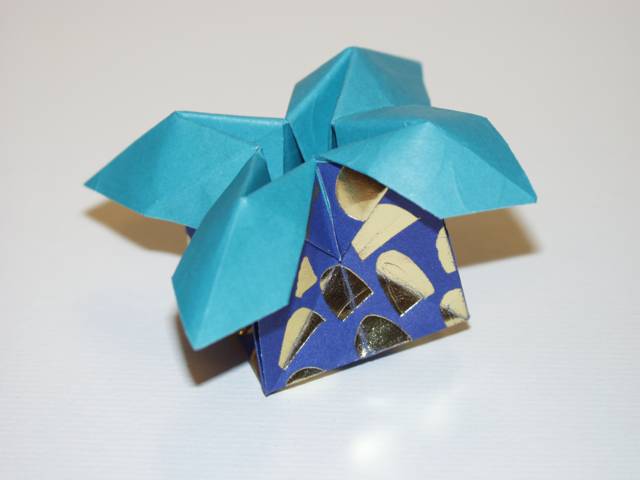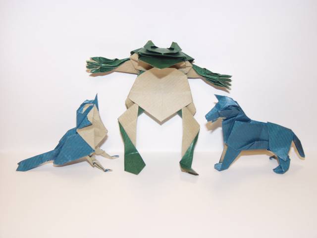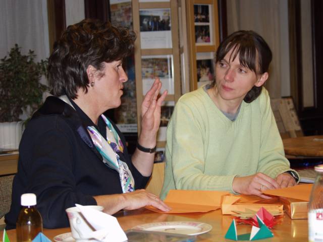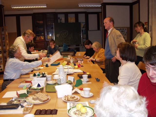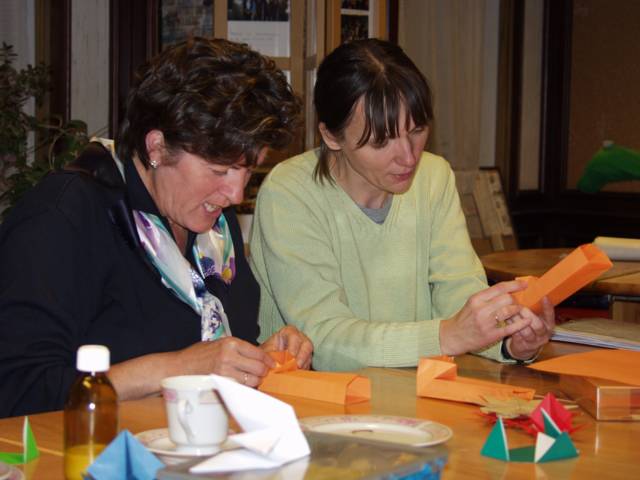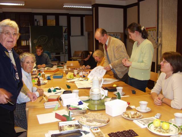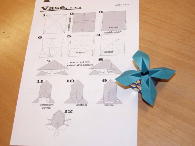 Peterpaul Forcher als Gast aus Österreich, viele Faltanleitungen mitgebracht (z.B. Vase), in japanischen Büchern veröffentlicht, nächste Faltung - aus quadratischer Grundform entsteht eine Tüte mit standfestem Boden (fertig siehe nächste Seite), Frosch, Vogel, Hund und Maske - was von Fortgeschrittenen gefaltet...