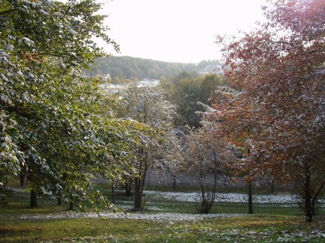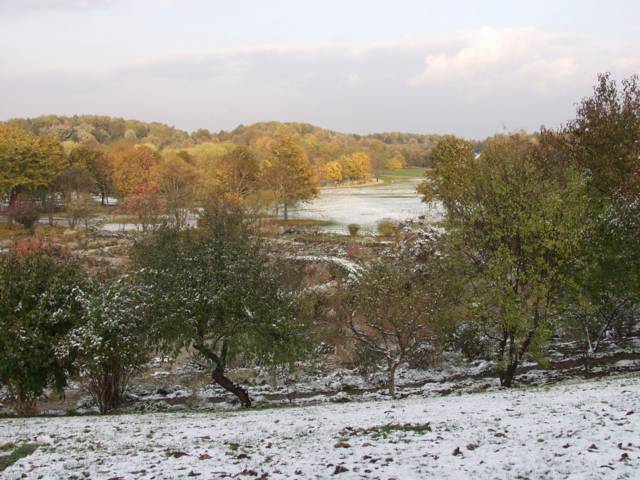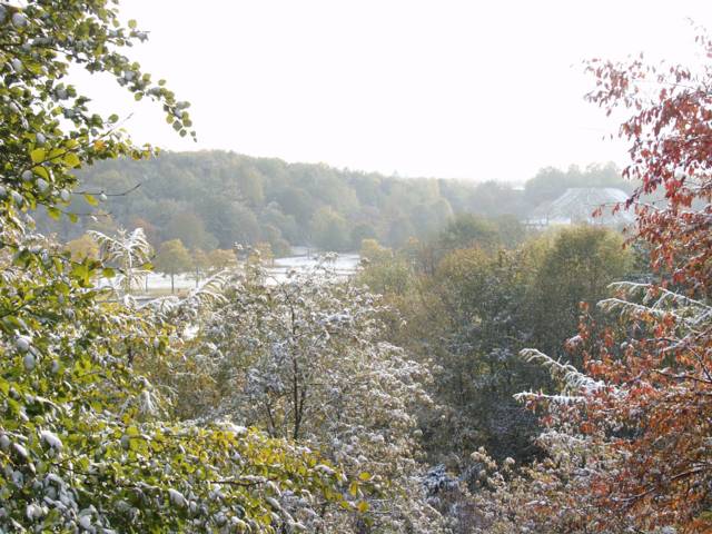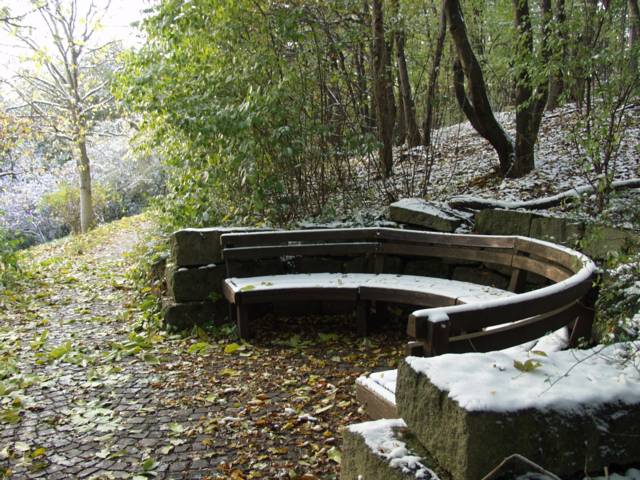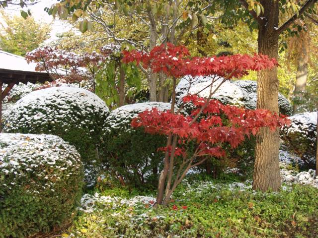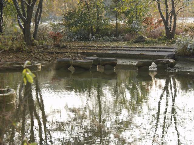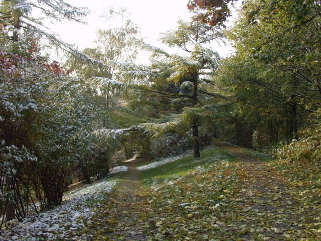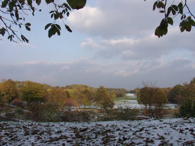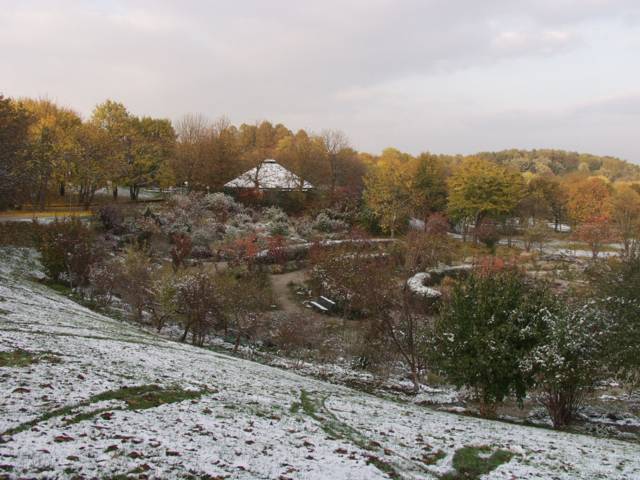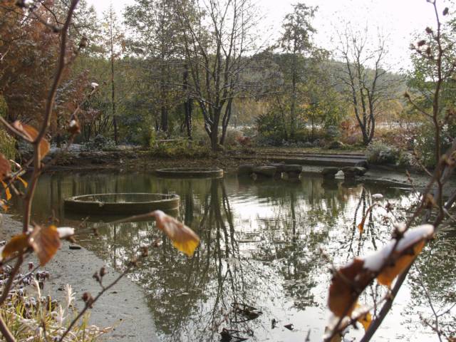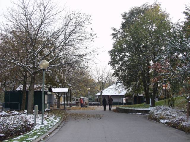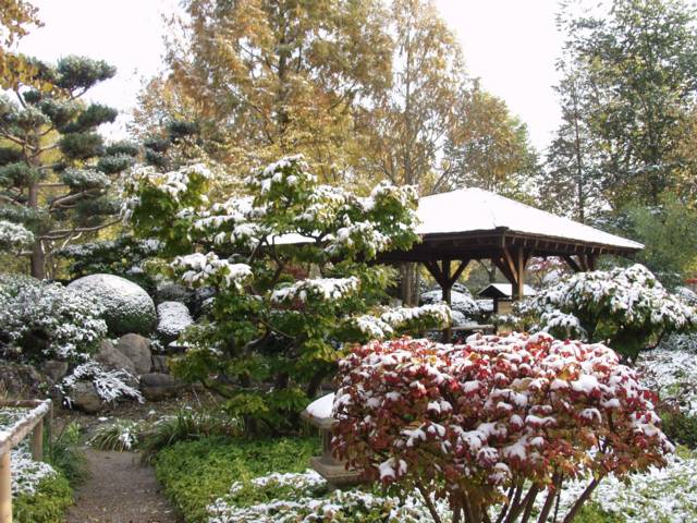 von Höhenwegen Einblicke in den Park, Japanischer Garten: Wasser wegen Reinigungsarbeiten zum Teil abgelassen, Steine ragen aus dem Wasser wie normal nicht zu sehen, Farben-und Formenspiel mit vorzeitigem Schnee, Biergarten am Rosengarten fertig zur Winterruhe